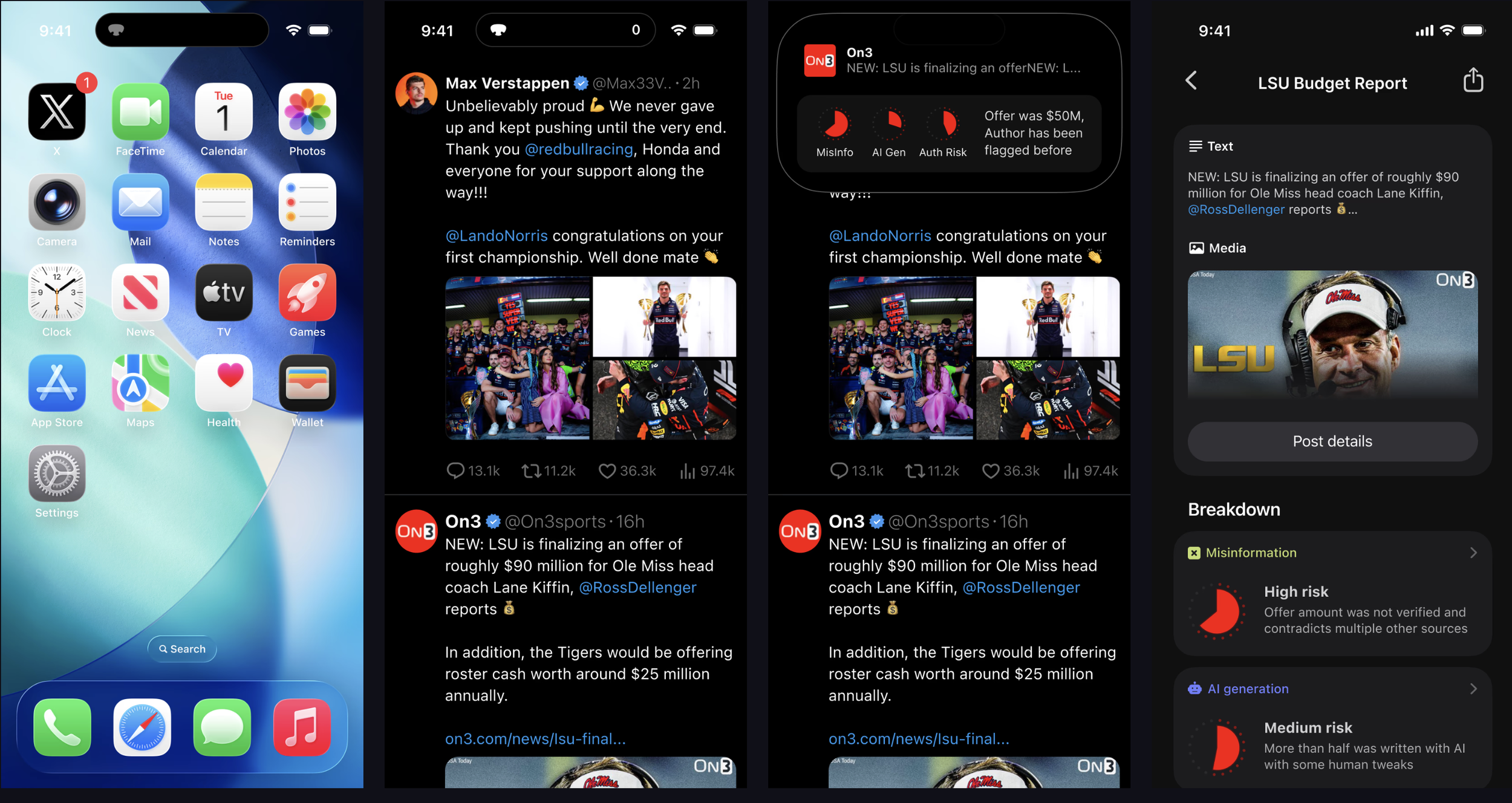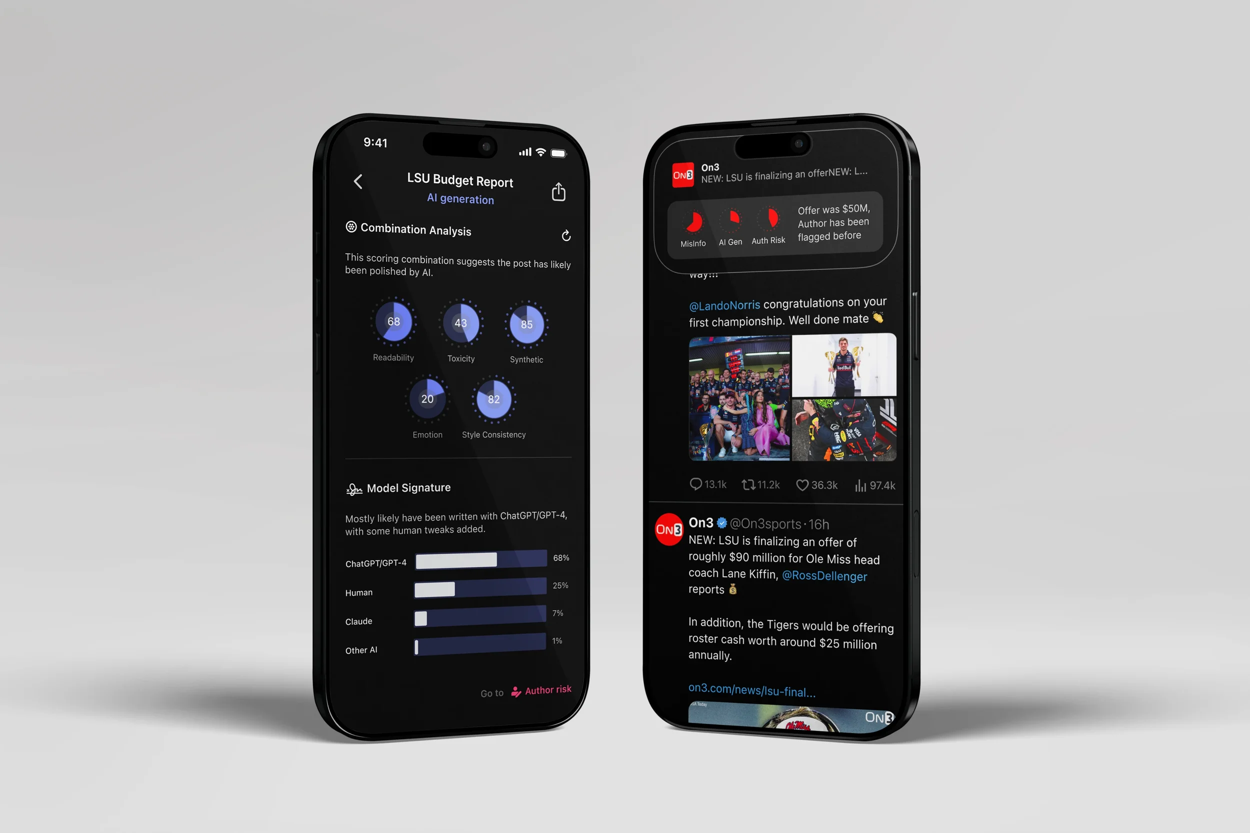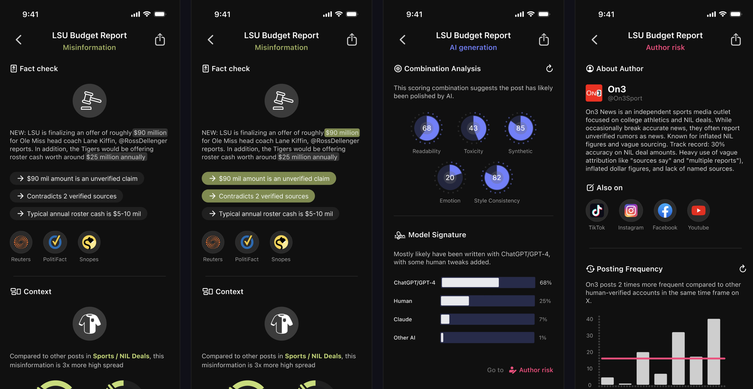 When a post feels questionable, users need more than a warning — they need context. Sniffo helps users dig deeper through layered analysis, combining misinformation signals, AI-generated content detection, and account-level risk patterns.